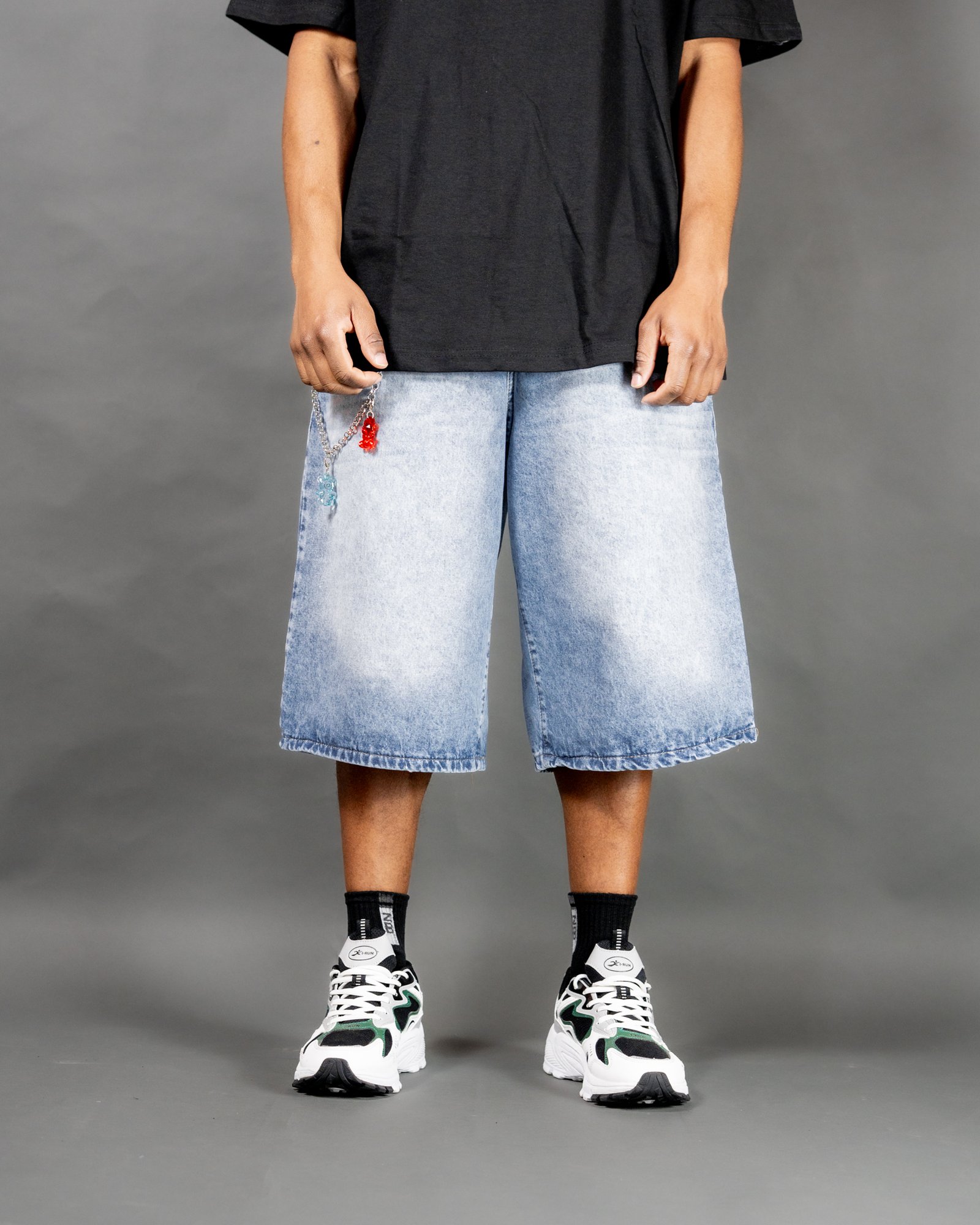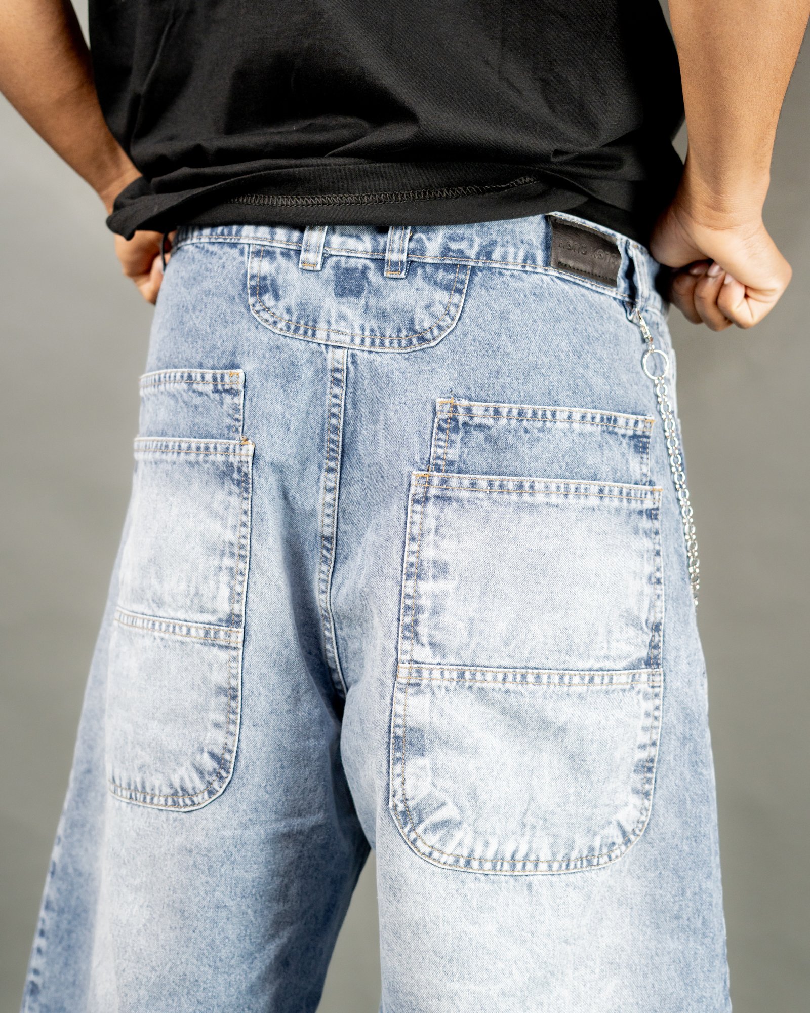 BERMUDA SUPER BAGGY AZUL CLARO CON LOCALIZADO, DETALLES EN LA PARTE TRASERA CON RECORTE Y BOLSILLOS DOBLES (INCLUYE ACCESORIO)